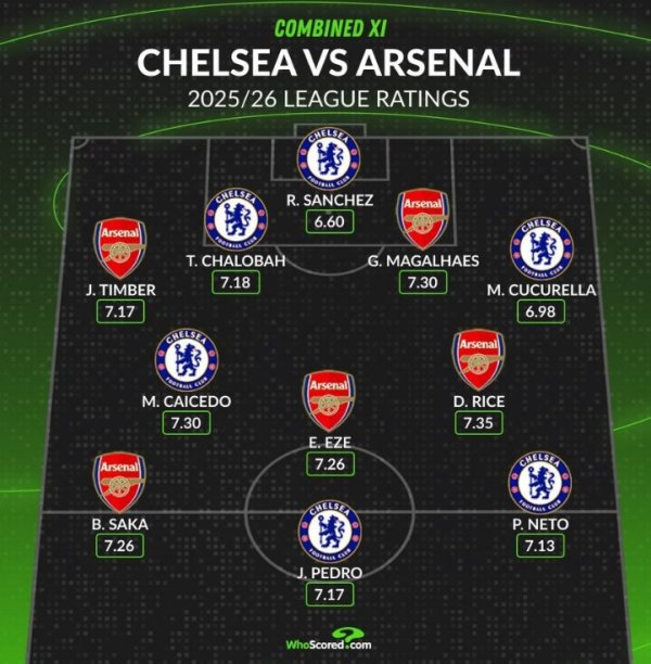 11月30日讯 本轮英超焦点战阿森纳对阵切尔西行将打响,数据网站Whoscored也清点了本赛季英超两队队员场均评分最高阵,具体如下: 门将:桑切斯(切尔西) 后卫:廷伯(阿森纳)、查洛巴(切尔西)、加布里埃尔(阿森纳)、库库雷利亚(切尔西) 中场:凯塞多(切尔西)、埃泽(阿森纳)、赖斯(阿森纳) 前卫:萨卡(阿森纳)、佩德罗(切尔西)、内托(切尔西)......