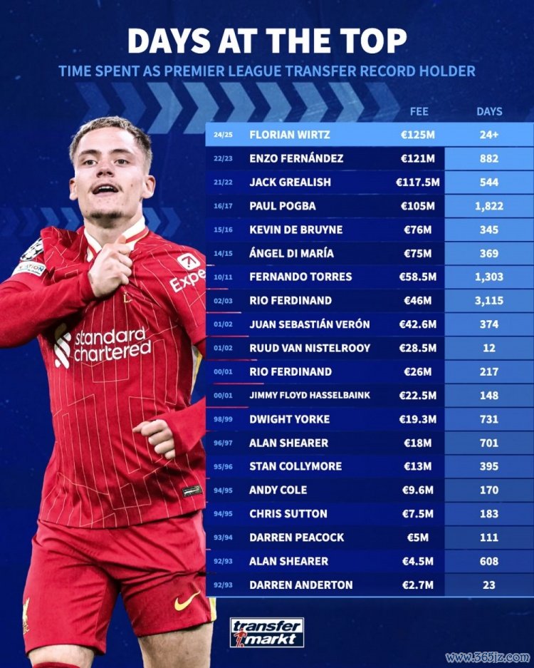 7月26日讯 德国转会市集列出了英超历史标王的保抓技能,其中费迪南德4600万欧保抓3115天最长,当今的标王为维尔茨,他的转会费为1.25亿欧元。