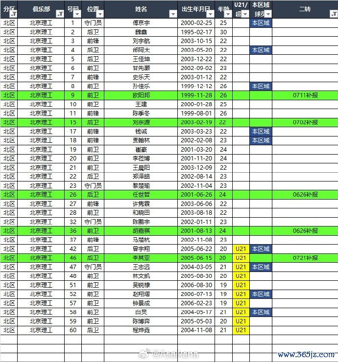 2025中乙联赛(北区)夏转后各队报名名单(绿色为夏转新报名球员)