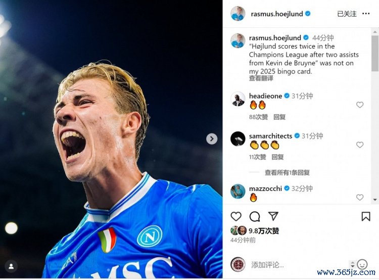霍伊伦社媒晒出庆祝进球的像片,并发文戏弄:“霍伊伦在欧冠比赛中梅开二度,还齐是德布劳内的助攻——这完满不在我2025年的脚本之中。”