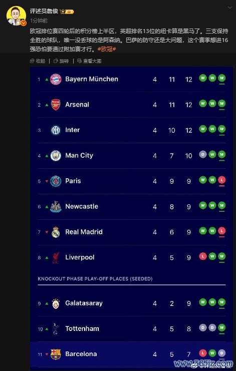 詹俊写谈:“欧冠排位赛四轮后的积分榜上游,英超名次13位的纽卡算是黑马了。三支保抓全胜的球队,唯独没丢球的是阿森纳。巴萨的防患照旧大问题,这个赛季思进16强只怕要通过附加赛才行。”