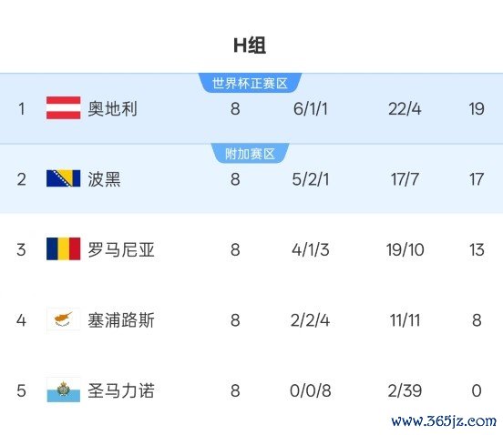 奥地利1-1波黑小组第一纵贯寰宇杯,波黑小组第二参加附加赛