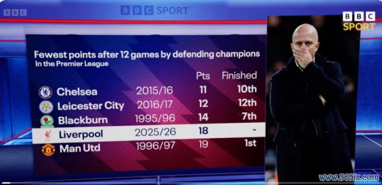 利物浦本赛季英超前12轮比赛仅积18分,成为英超历史同时积分第四少的卫冕冠军。
