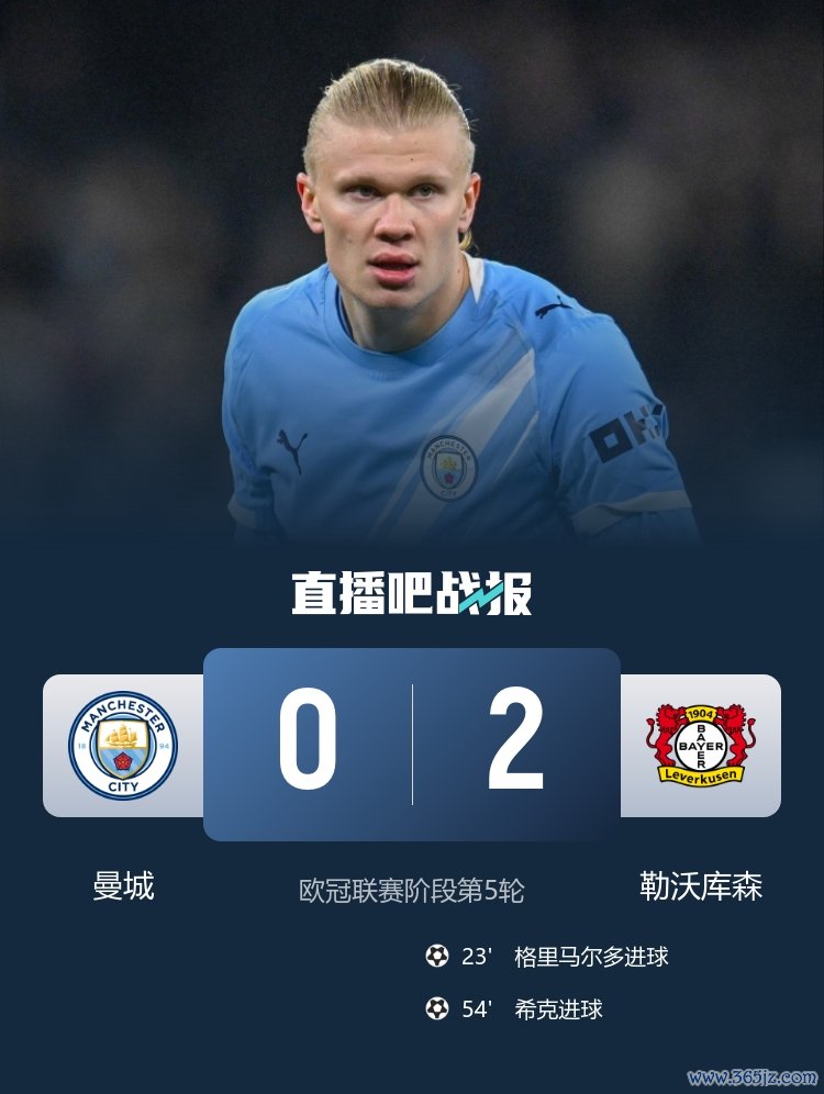 格里马尔多、希克破门,曼城0-2不敌勒沃库森,遭逢本赛季欧冠首败。