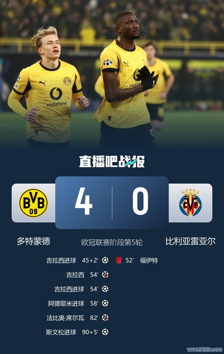 吉拉西双响,阿德耶米、端淑松破门,多特4-0十东说念主比利亚雷亚尔近四场比赛首胜。