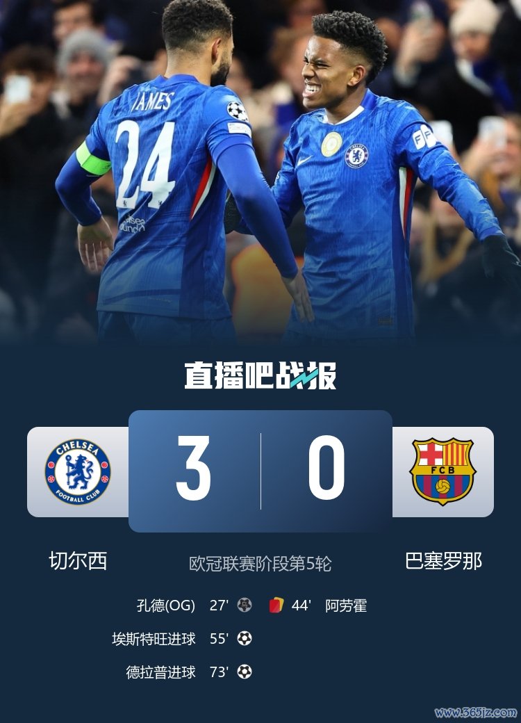 三连胜!切尔西3-0完胜巴萨 埃斯特旺一条龙德拉普立功阿劳霍红牌