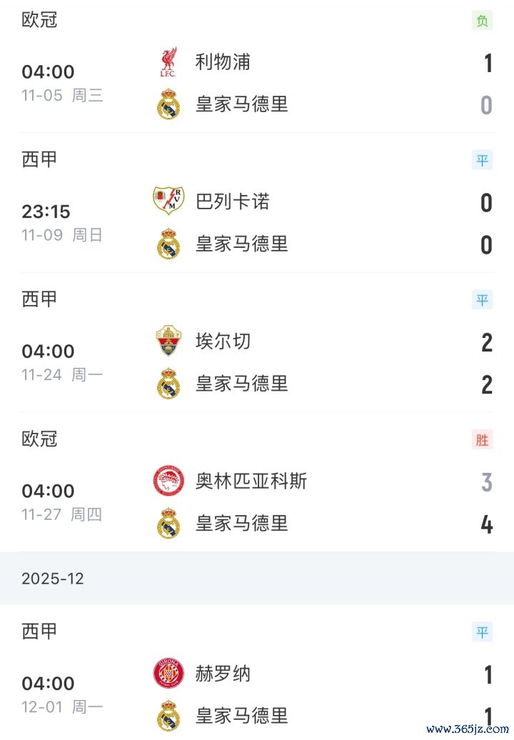 皇马的近五场比赛仅在上一场4-3治服希腊超队奥林匹亚科斯,联赛近3轮面临巴列卡诺、埃尔切、赫罗纳均未能全取3分。