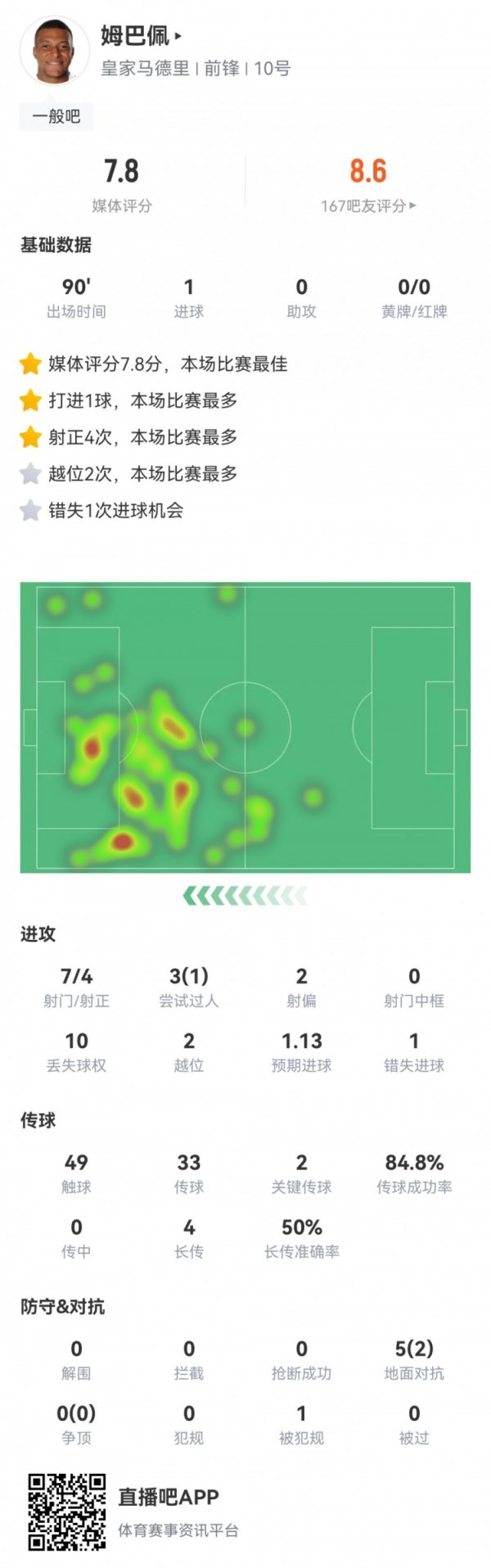 10月20日讯 本轮西甲,皇马1-0赫塔费。此役姆巴佩首发打满全场,球员全场要点数据如下↓ 7射4正 1粒进球 3次过东谈主1顺利 10次丢失球权 预期进球1.13 1次错失进球 2次越位 49次触球 传球顺利率84.8% 2次关节传球 5次抵抗顺利2次 评分7.8......
