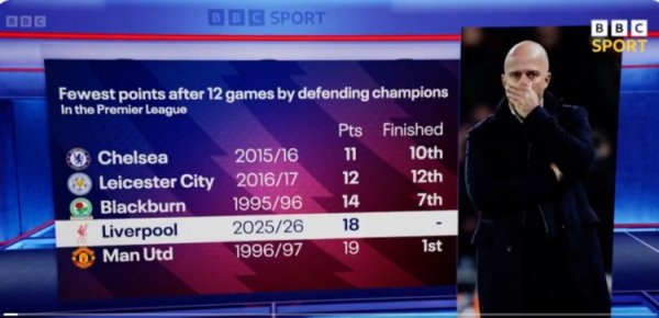 11月24日讯 英超第12轮比赛,利物浦主场0-3不敌诺丁汉丛林。 利物浦本赛季英超前12轮比赛仅积18分,成为英超历史同时积分第四少的卫冕冠军。 英超历史赛季前12轮积分最少卫冕冠军排行: 切尔西(2015-2016)——11——最终排行第10 莱斯特城(2016-2017)——12——最终排行第12 布莱克本(1995-1996)——14——最终排行第7 利物浦(2025-2026)——18——? 曼联(1996-1997)——19——最终排行第1......