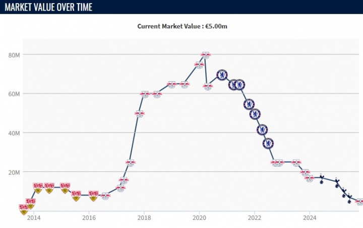 29岁的维尔纳在2020年以5300万欧元转会费加盟切尔西,亦然在2020年,球员巅峰身价一度达到8000万欧元,但如今维尔纳身价一经跌至500万欧,他与莱比锡的公约将于明夏到期。