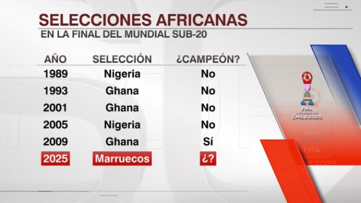 证实ESPN的统计,摩洛哥成为第三支过问世青赛决赛的非洲球队,之前尼日利亚(2次)和加纳(3次)先后过问过决赛,但独一加纳在2009年夺得过冠军。