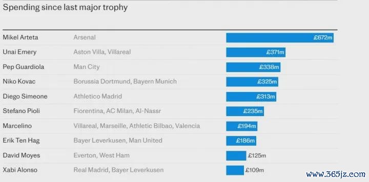 电讯报统计了上一次夺冠之后,各大主帅在引援上的累计破钞,阿尔特塔破钞6.72亿英镑断层最初。