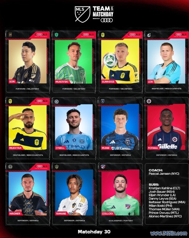 中场:艾登-奥尼尔(纽约城)、穆赫塔尔(纳什维尔)、罗宾-洛德(明尼苏达联)、穆索夫斯基(西雅图海湾东谈主)、孙兴慜(洛杉矶FC)