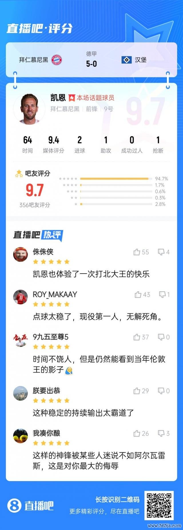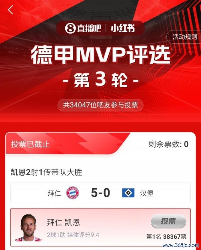 第三轮评比恶果结出炉,凯恩2射1传,匡助拜仁5-0大捷汉堡,取得吧友近4万票的解救,打败格里马尔多当选 【直播吧X小红书德甲第3轮最好球员】!