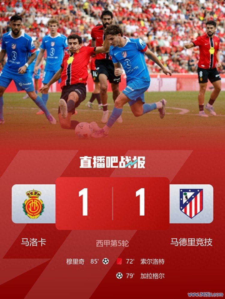 直播吧9月22日讯 西甲第5轮,马洛卡镇守主场伊比利亚之星球场迎战马德里竞技。上半场,汉茨科造点,阿尔瓦雷斯失点被扑。易边再战,小西蒙尼错失良机,索尔洛特替补染红,加拉格尔破僵,穆里奇扳平。最终马竞1-1马洛卡。积分榜方面,马竞6分暂第12,马洛卡2分第19。