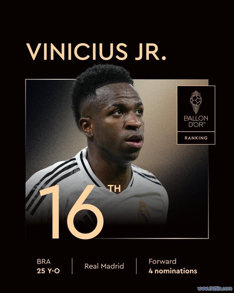 雷速体育9月23日讯 官方音书,维尼修斯在本年金球奖评比中位列第16名,生计第四次参加前30。