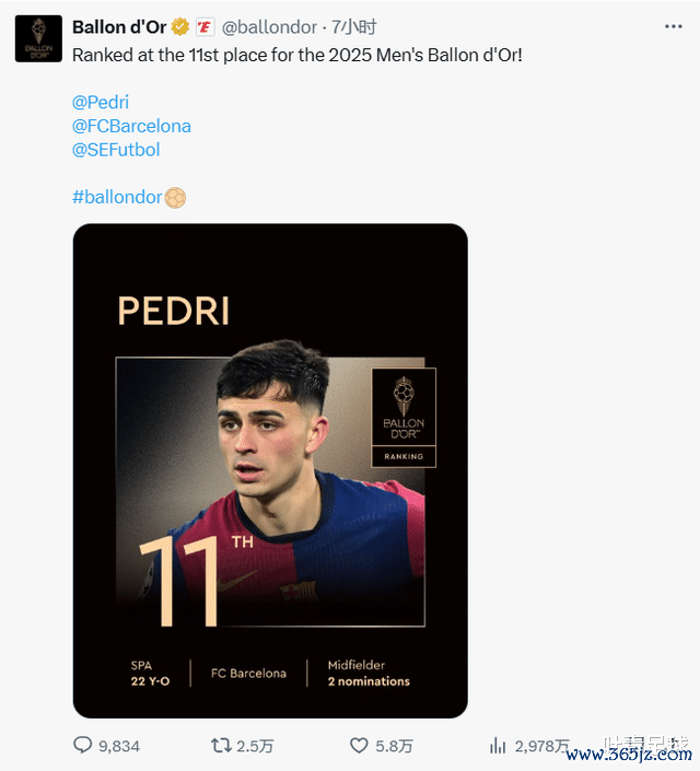 从2024-25赛季的推崇来看,佩德里配得上更好的名次。