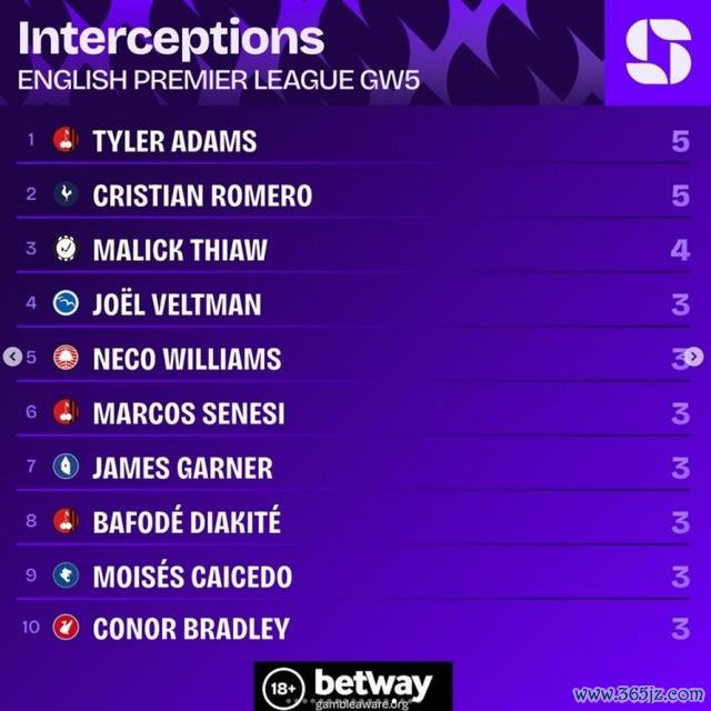 直播吧9月24日讯 英超第5轮战罢,squawkafootball列各项数据排名,泰勒-亚当斯以及罗梅罗是本轮完成禁绝次数最多的球员,各有5次。