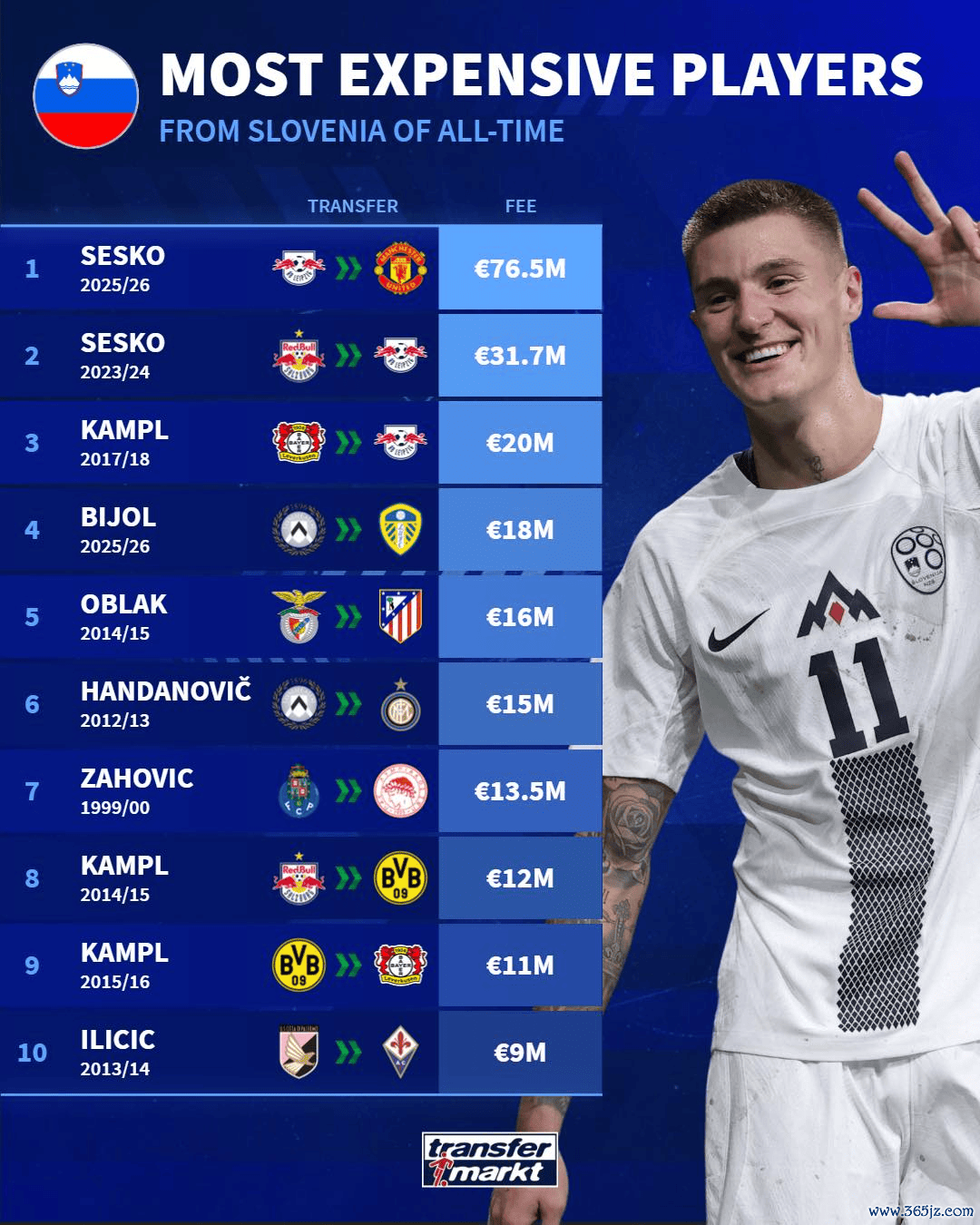 德转发布了榜单,实质为斯洛文尼亚球员历史上的单笔转会费价钱榜。
