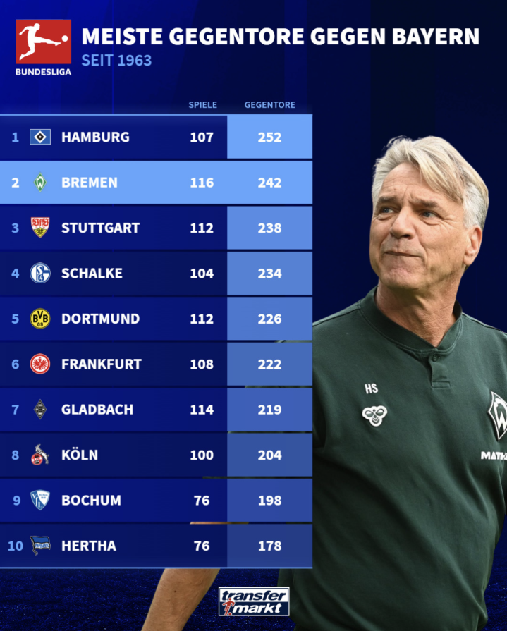 虎扑09月26日讯德转统计了德甲史上被拜仁攻破球门次数最多的前十球队榜单。汉堡被拜仁打进252球排行第一,不莱梅被进242球排行第二。