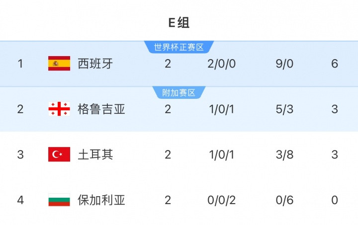 西班牙国度队将于10月中旬辞世初赛中对阵格鲁吉亚和保加利亚,当今西班牙积6分位列E组第一,越过格鲁吉亚3分。