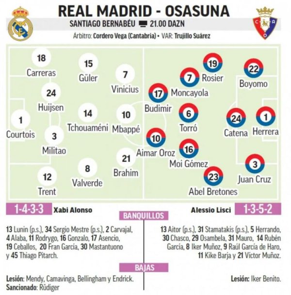 直播吧8月19日讯 北京本事来日凌晨3点,皇马将在西甲首轮比赛中主场对阵奥萨苏纳。西班牙媒体《马卡报》谈判了皇马此役的首发威望,姆巴佩、维尼修斯、迪亚斯构成三叉戟。 《马卡报》谈判皇马西甲首轮先发威望 门将:库尔图瓦 后卫:A费、怀森、米利唐、阿诺德 中场:居勒尔、琼阿梅尼、巴尔韦德 时尚:维尼修斯、姆巴佩、迪亚斯......