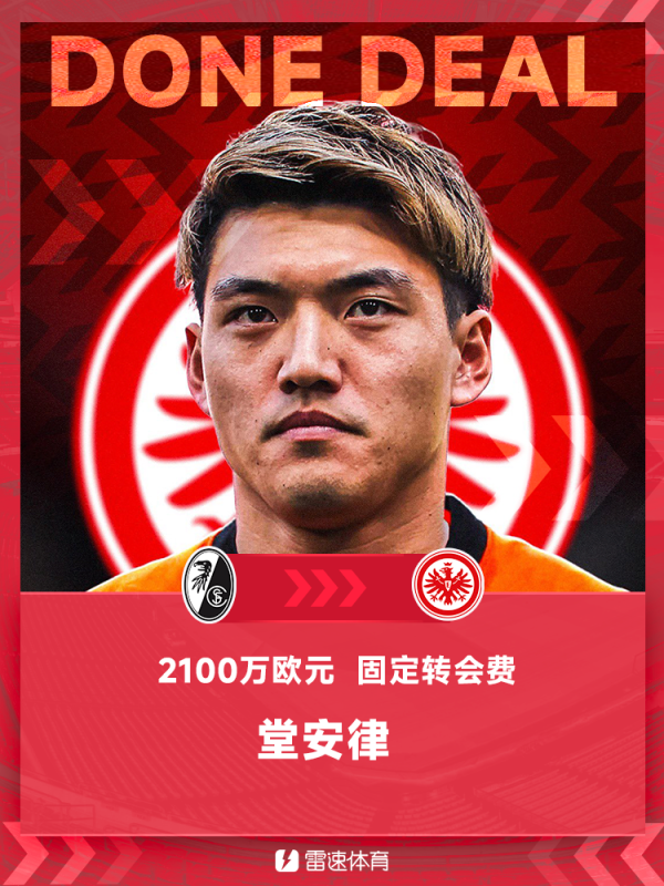 雷速体育8月7日讯 法兰克福官方本日晓喻,日本国脚、服从于弗赖堡的中场球员堂安律加盟球队。 据此前罗马诺报说念,本次来往的固定转会费达2100万欧元,外加100万欧元的附加要求。 堂安律现年27岁,司职前卫,他在2022年从埃因霍温加盟弗赖堡,现在共代表球队出战123次,打进26球,并孝敬23次助攻。他现在的德回身价为2500万欧元。 法兰克福官宣视频......