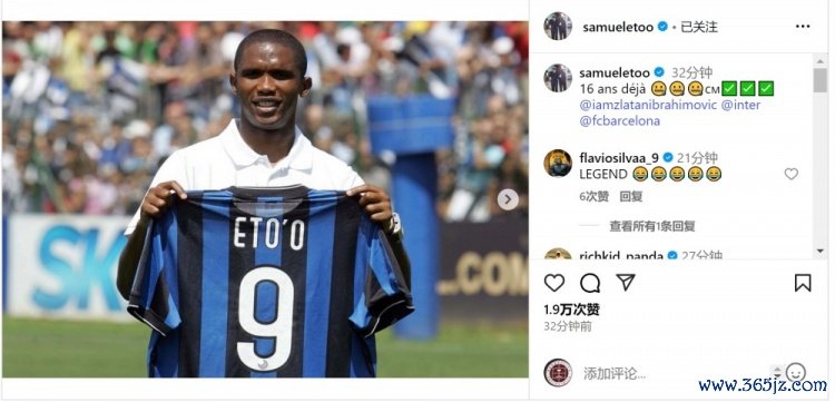 埃托奥社媒晒出我方与伊布其时互换东家的相片,配文:“16年前。”并@伊布、国米和巴萨。