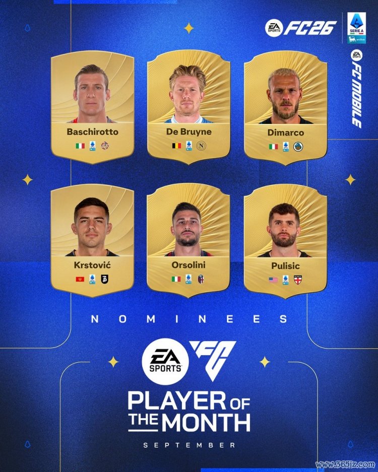 10月2日讯 意甲官方公布了9月最好球员的候选名单,德布劳内、普利西奇、迪马尔科在列。