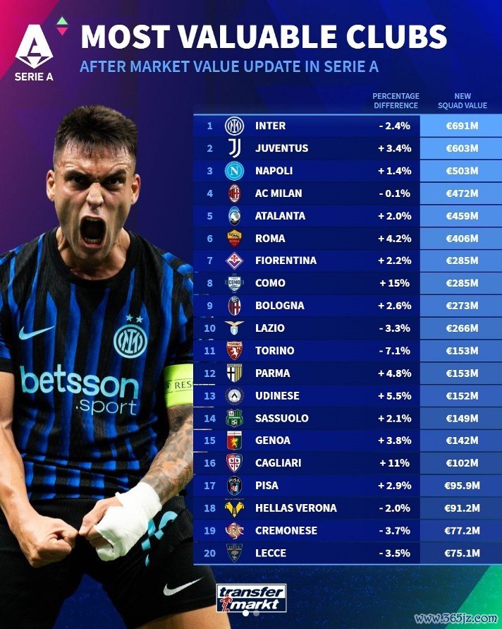 意甲俱乐部阵立足价排名:国米6.91亿欧元第一,科莫2.85亿欧第八