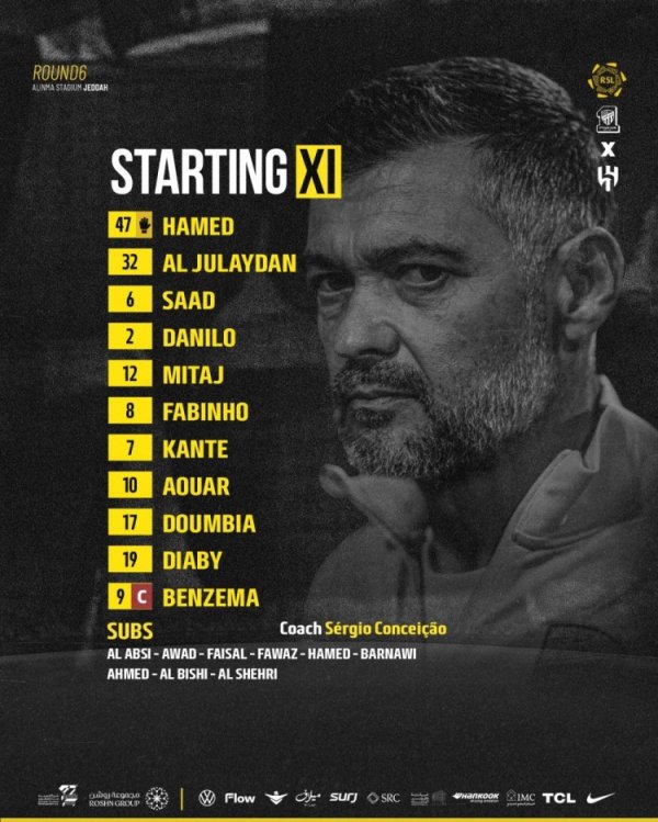 10月25日讯 在本轮沙特联赛的一场焦点大战中,吉达蚁合主场对阵利雅得月牙,赛前,两队公布了本场比赛的首发声势。 吉达蚁合首发:47-哈麦德、32-朱莱丹、6-萨德-穆萨、2-达尼洛、12-米塔赫、8法比尼奥、7-坎特、10-奥亚尔、17-敦比亚、19-迪亚比、9-本泽马 利雅得月牙首发:37-布努、19-特奥、3-库利巴利、87-坦巴蒂、88-哈马德-亚米、10-马尔科姆、22-米林科维奇、8-鲁本-内维斯、16-纳赛尔-多萨里、9-莱昂纳多、7-努涅斯......