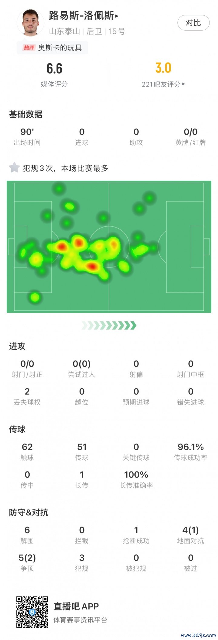 阐明欠安!泰山中卫洛佩斯全场4次顽抗1次得胜,5次争顶2次得胜