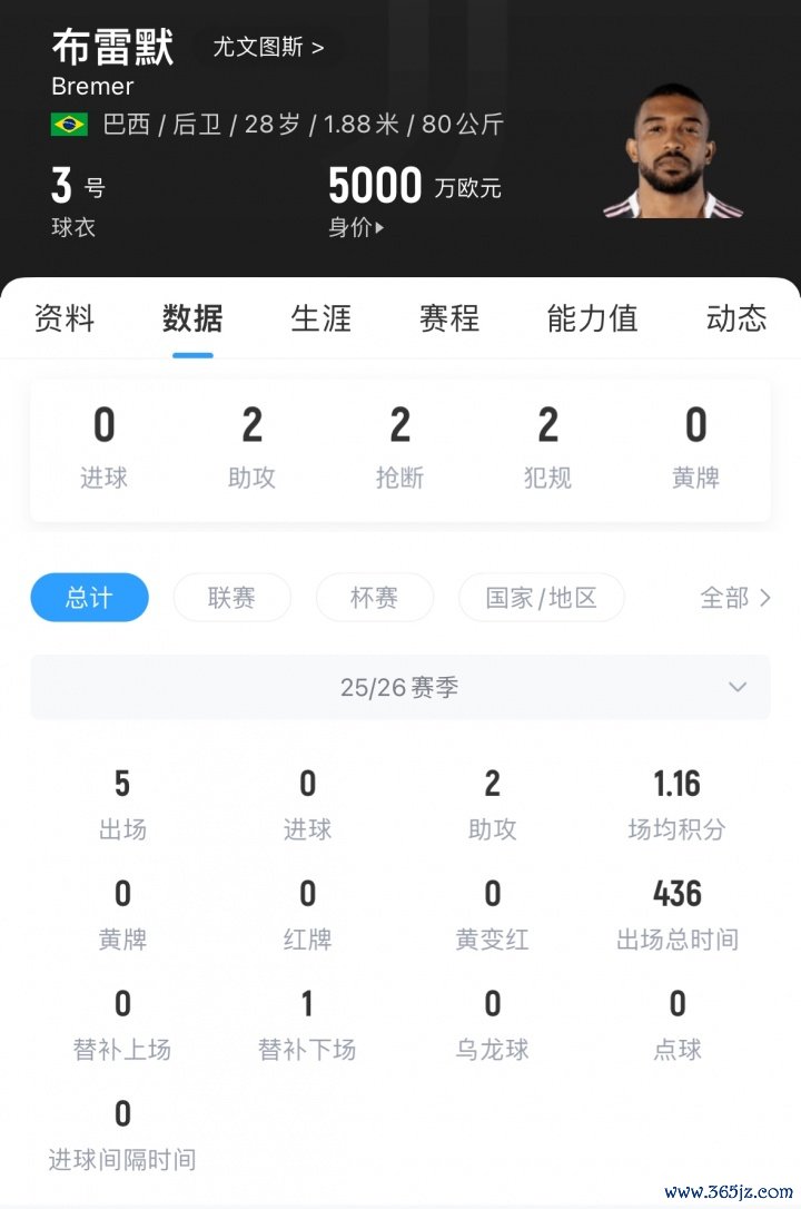 布雷默客岁10月遇到十字韧带断裂重伤,本年8月重返赛场,本赛季他为尤文出场5次,他上一次为球队出场是9月28日1-1战平亚特兰大的比赛。