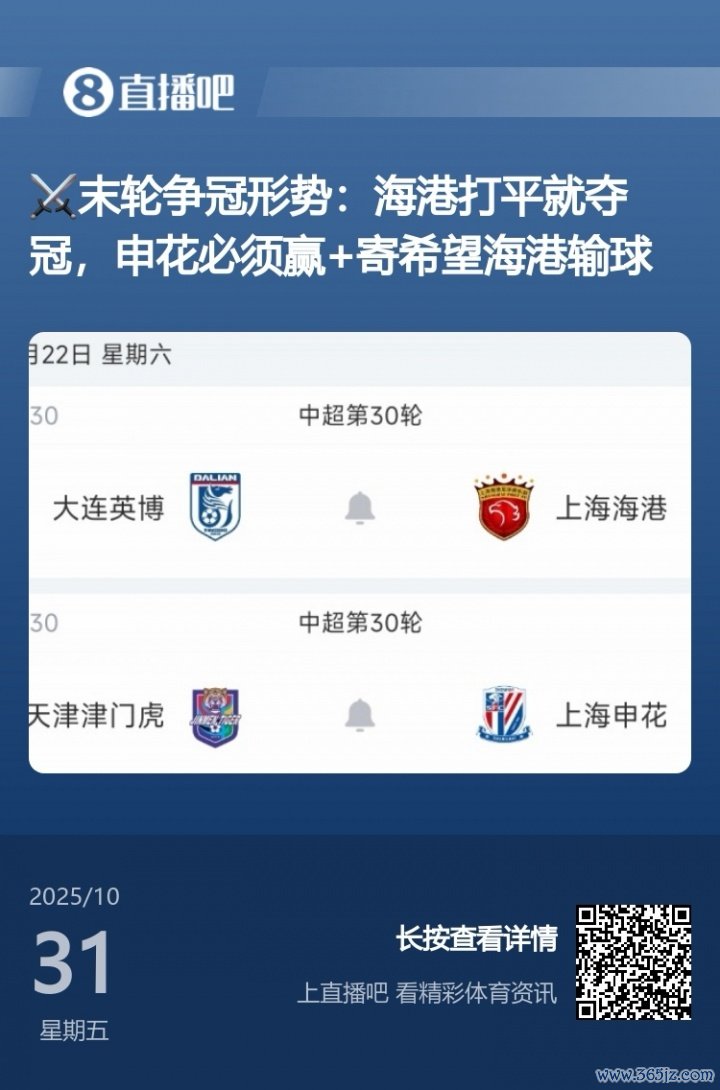 末轮海港客战大连,申花客战津门虎。