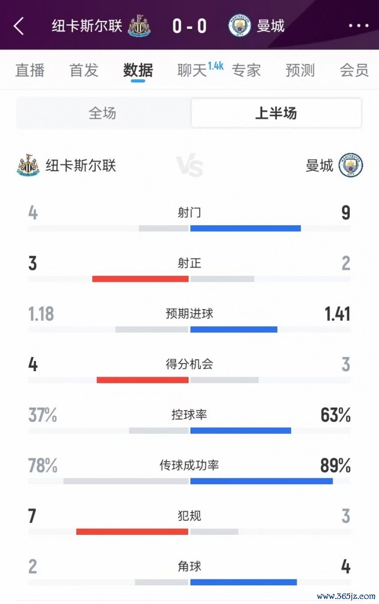 纽卡vs曼城半场数据:射门4-9、射正3-2、得分契机4-3