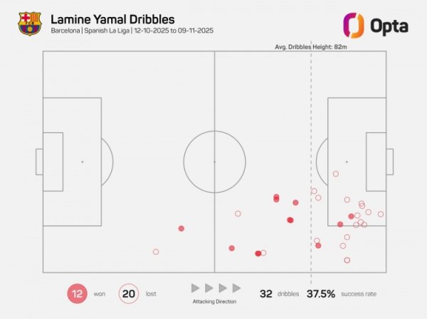 11月12日讯 据Opta统计,10月份外洋比赛日之后,亚马尔是五大联赛同时尝试过东谈主次数最多的球员。 Opta指出,10月12日以来,亚马尔联赛尝试过东谈主32次,与图卢兹球员博霍比肩五大联赛最多,过东谈主成服从37.5%。......