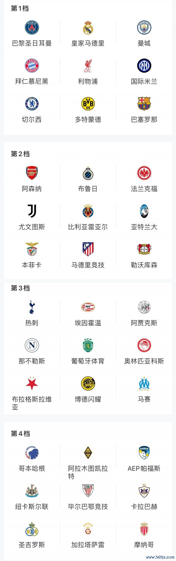 25/26赛季欧冠抽签分档情况
