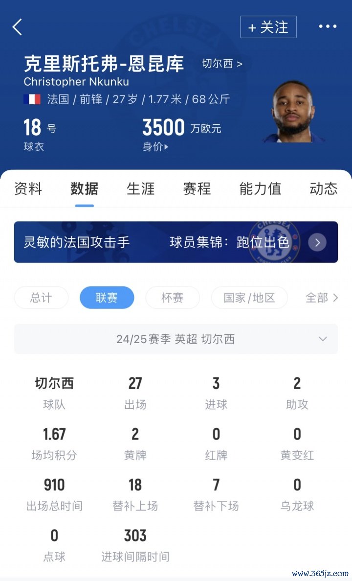 恩昆库现年27岁,与切尔西现存合同在2029年到期,现德转估值为3500万欧。恩昆库2023年夏窗6000万欧从莱比锡加盟切尔西,现在已出场62次,打入18球并有5次助攻。