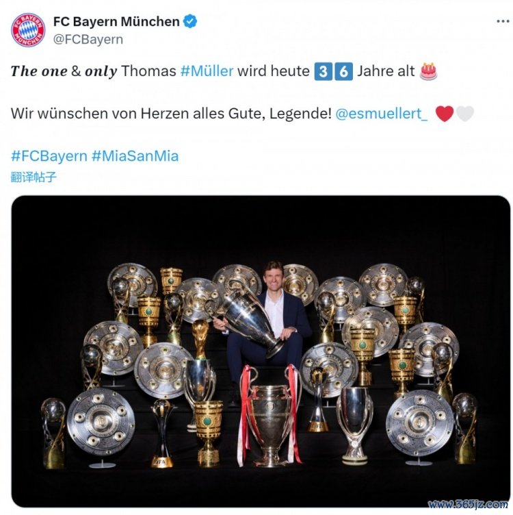 拜仁官方社媒晒出穆勒与奖杯的合照,配文:“唯独无二的托马斯-穆勒今天迎来36岁诞辰,咱们赤忱祝愿这位据说诞辰舒坦!”