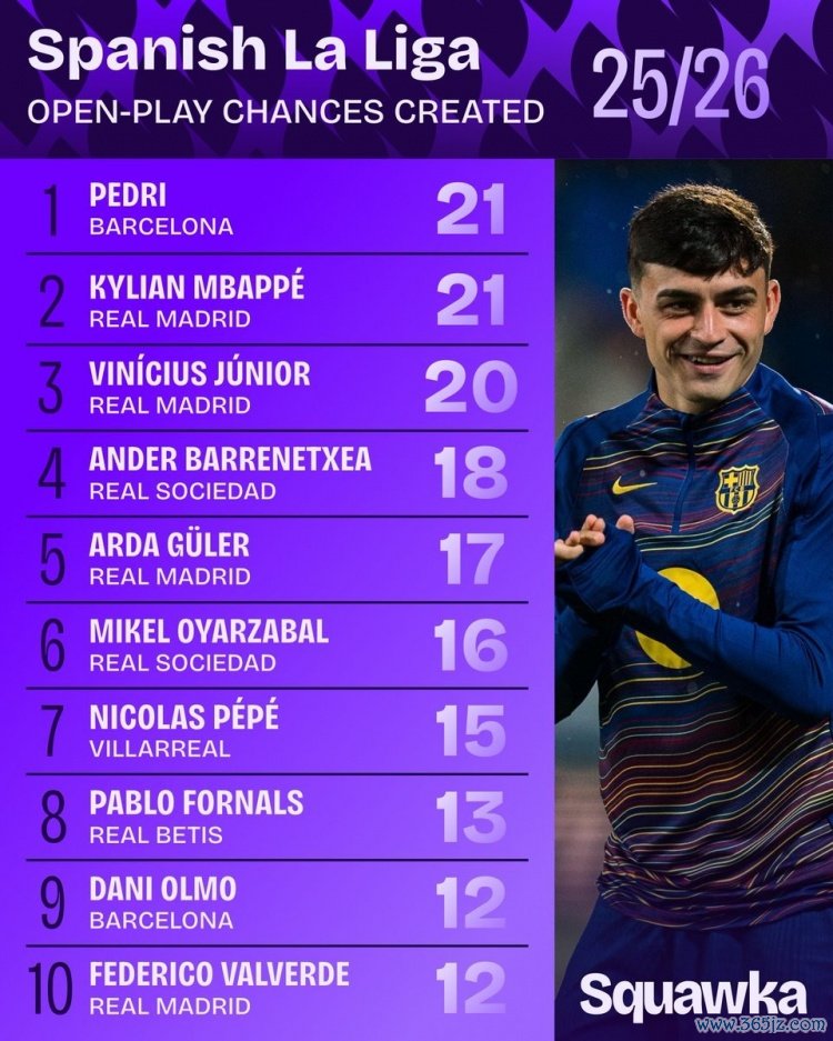 西甲本赛季盛开战创造契机榜:佩德里、姆巴佩21次比肩第一