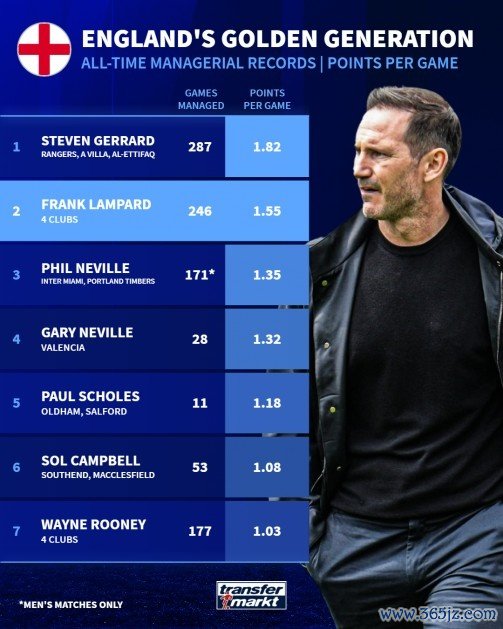 德国转会商场盘货了英格兰“黄金一代”球员在阐述岗亭上的抓教战绩,杰拉德以场均1.82分居首,兰帕德以场均1.55分位居次席。