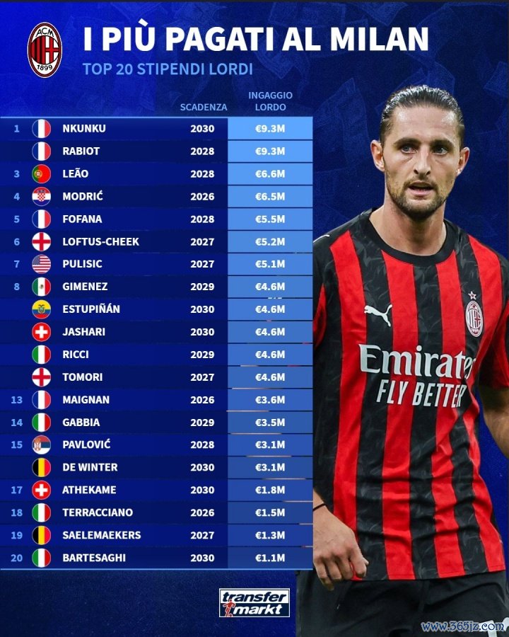 11月20日讯 德转统计了AC米兰队内年薪名次前20的球员,两名法国新援恩昆库、拉比奥特以930万欧元的年薪并排第一,莱奥660万欧排名第三。