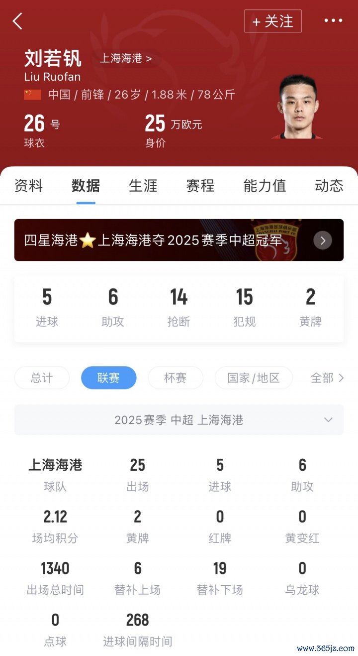 26岁的刘若钒冬窗加盟海港,本赛季进展出色,5球6助匡助海港夺冠。